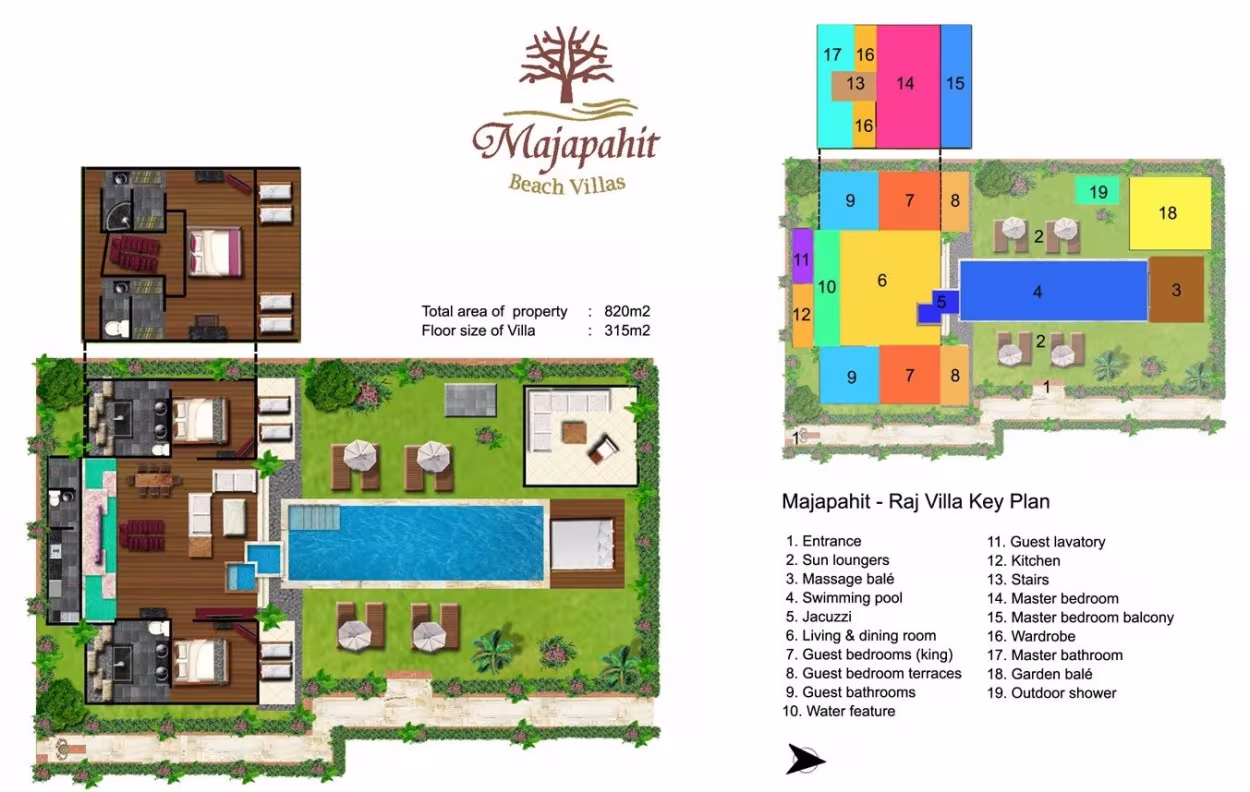 Die Villa Majapahit Raj befindet sich in einem sicheren Bereich innerhalb eines Ensembles von drei Villen und besteht aus einem zweistöckigen Haus mit drei Schlafzimmern sowie einem privaten, ummauerten Garten mit einem 12 Meter langen Swimmingpool. Das Hauptschlafzimmer befindet sich im Obergeschoss, während die beiden Gästezimmer im Erdgeschoss auf beiden Seiten des mit Ventilatoren gekühlten Wohn- und Esszimmers angeordnet sind, das sich direkt zum Pool und Garten öffnet. Ein besonderes Highlight ist der doppelte Jacuzzi, der sich in den Wohnbereich erstreckt und überläuft in den Pool. Am Ende des Pools befindet sich ein Massagepavillon, und in einer Ecke des Gartens lädt ein großer Entspannungspavillon (Balé) zum Verweilen ein.